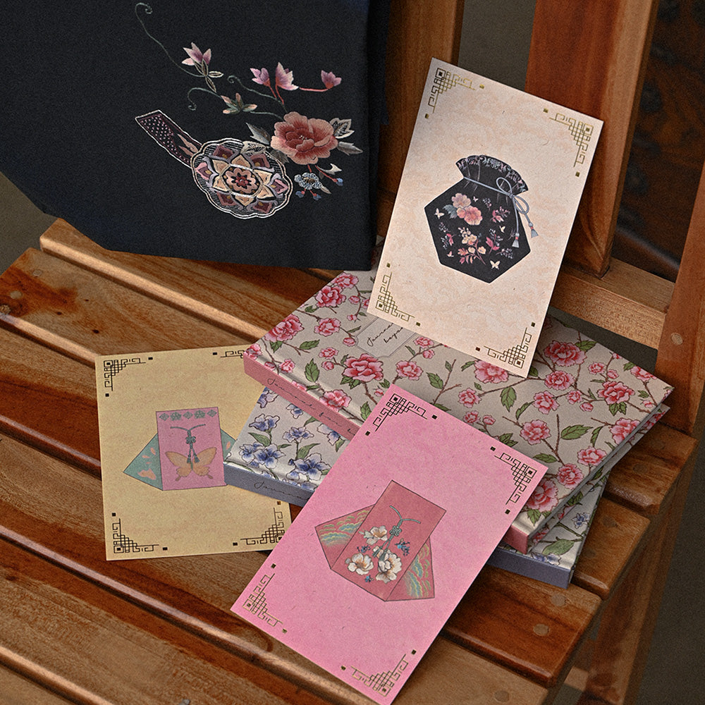 - 【Gold Foil & Hanji Paper】 Crafted from special paper that showcases the timeless beauty and texture of traditional Korean hanji, with gold foil accents on the edges of the postcards and packaging for an elegant finishing touch.